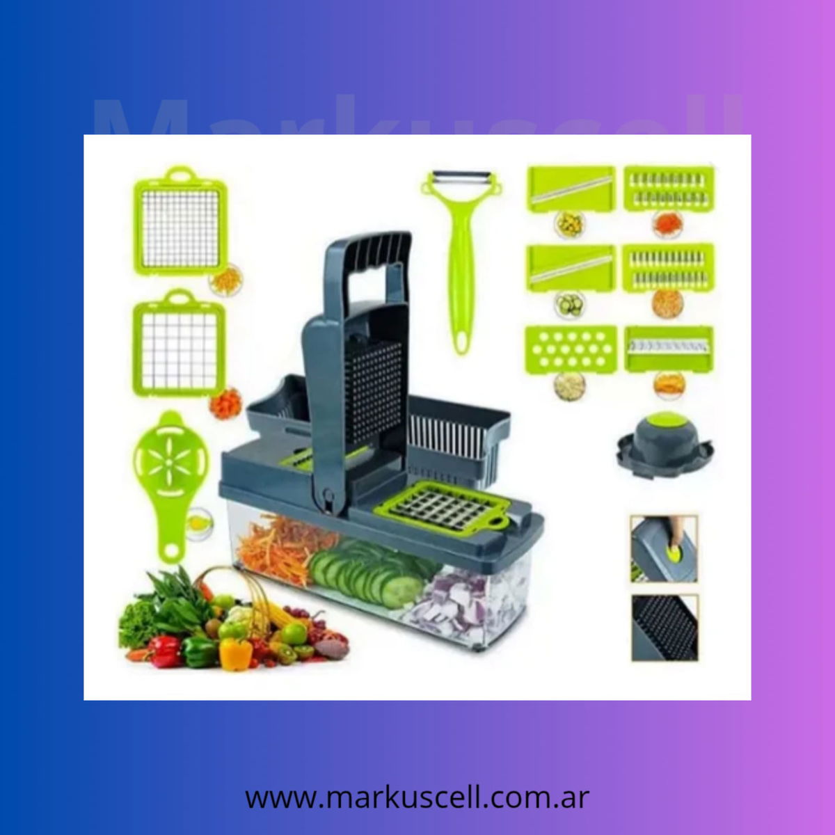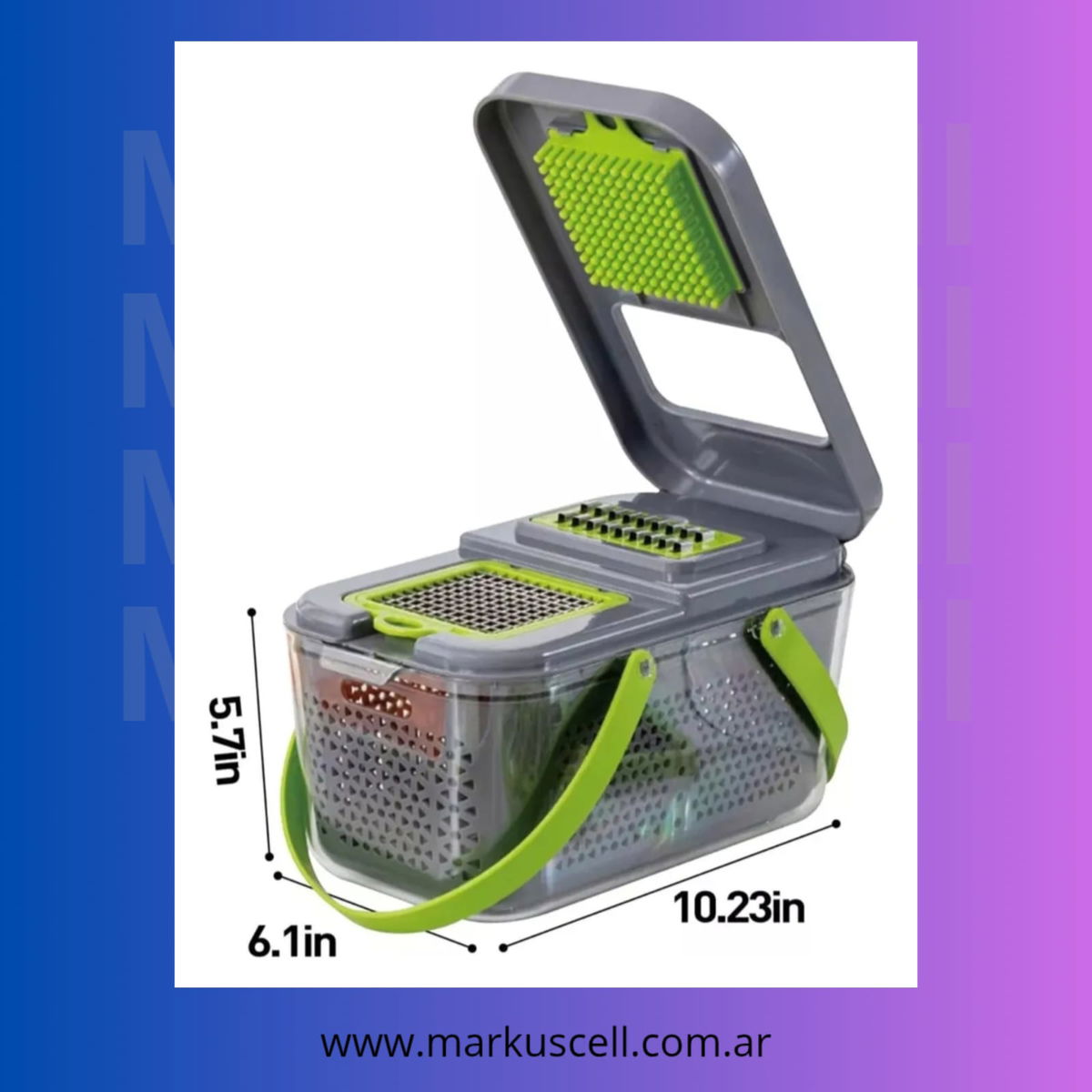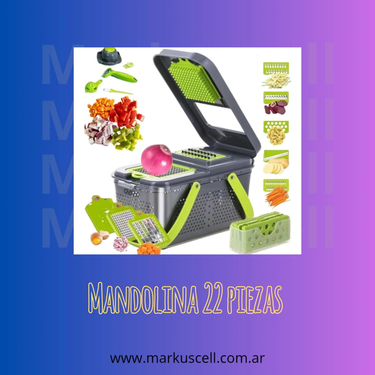 Este modelo cuenta con 22 cuchillas intercambiables de acero inoxidable, lo que permite obtener diferentes tipos de cortes según las necesidades de cada receta. Su cuerpo de plástico resistente asegura durabilidad y facilidad de manejo, mientras que la manija proporciona un agarre cómodo y seguro durante su uso.