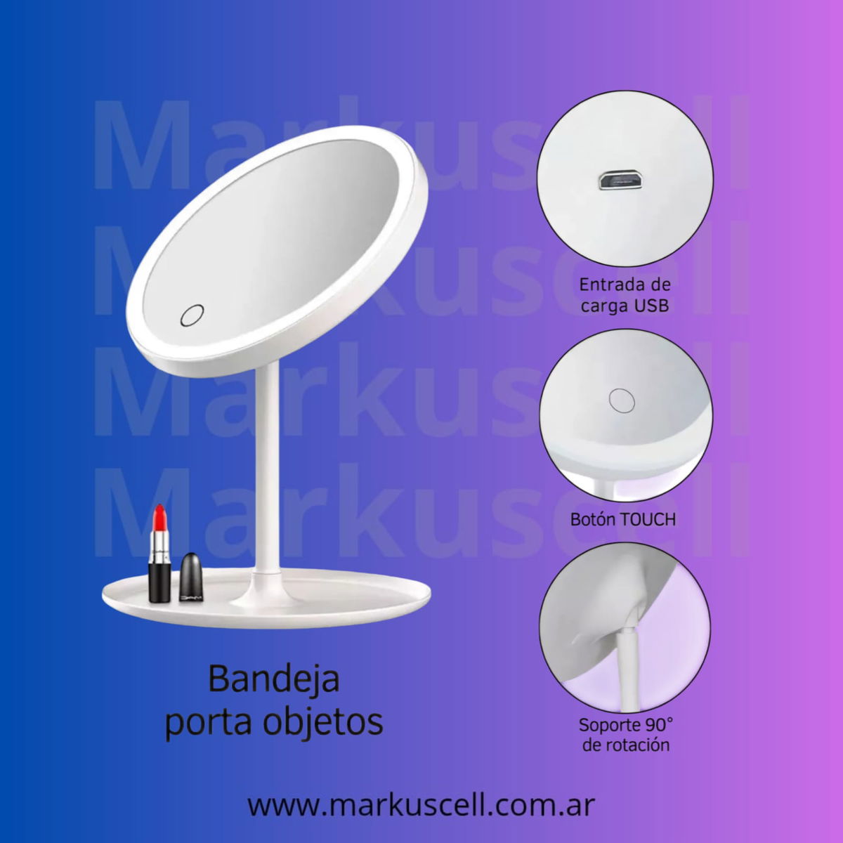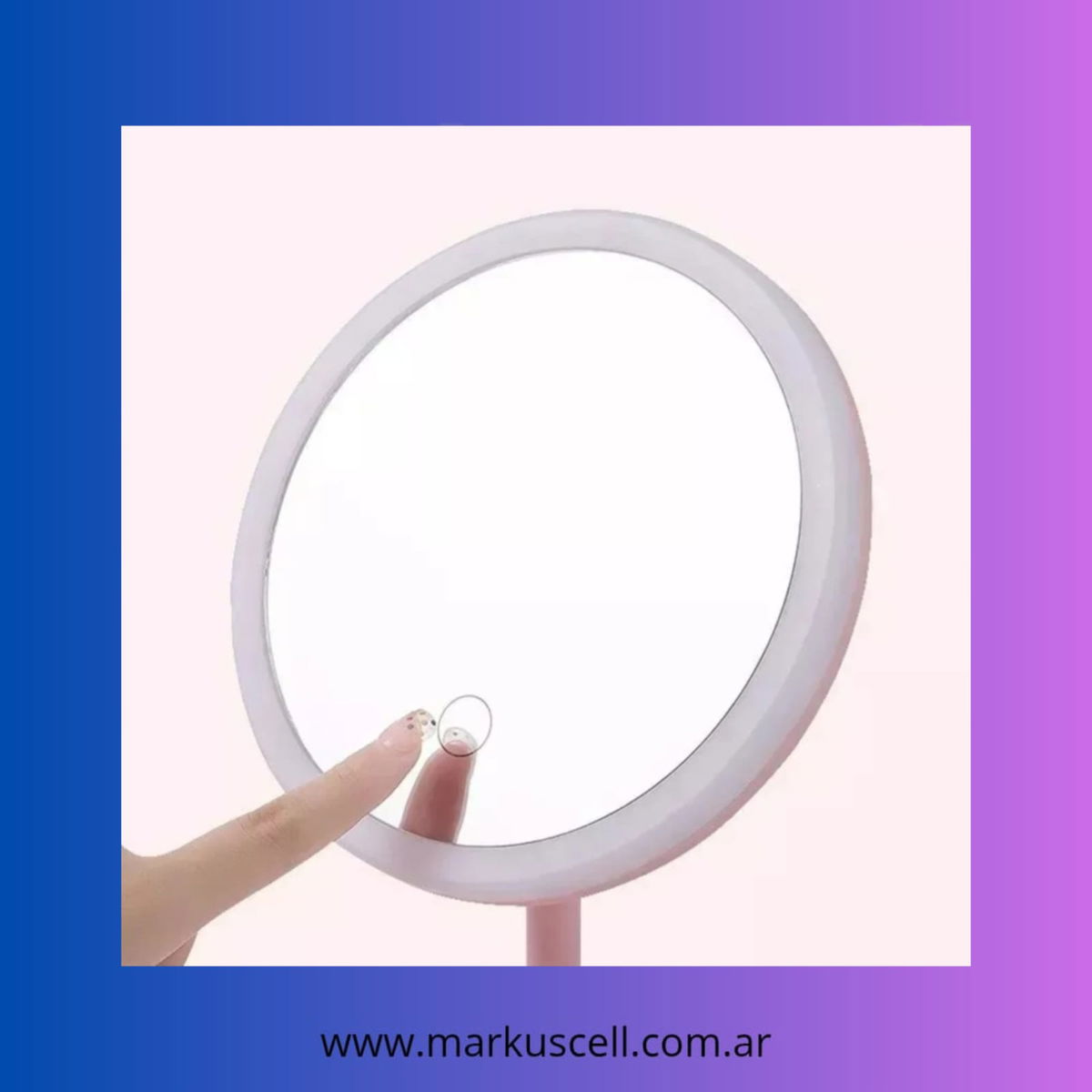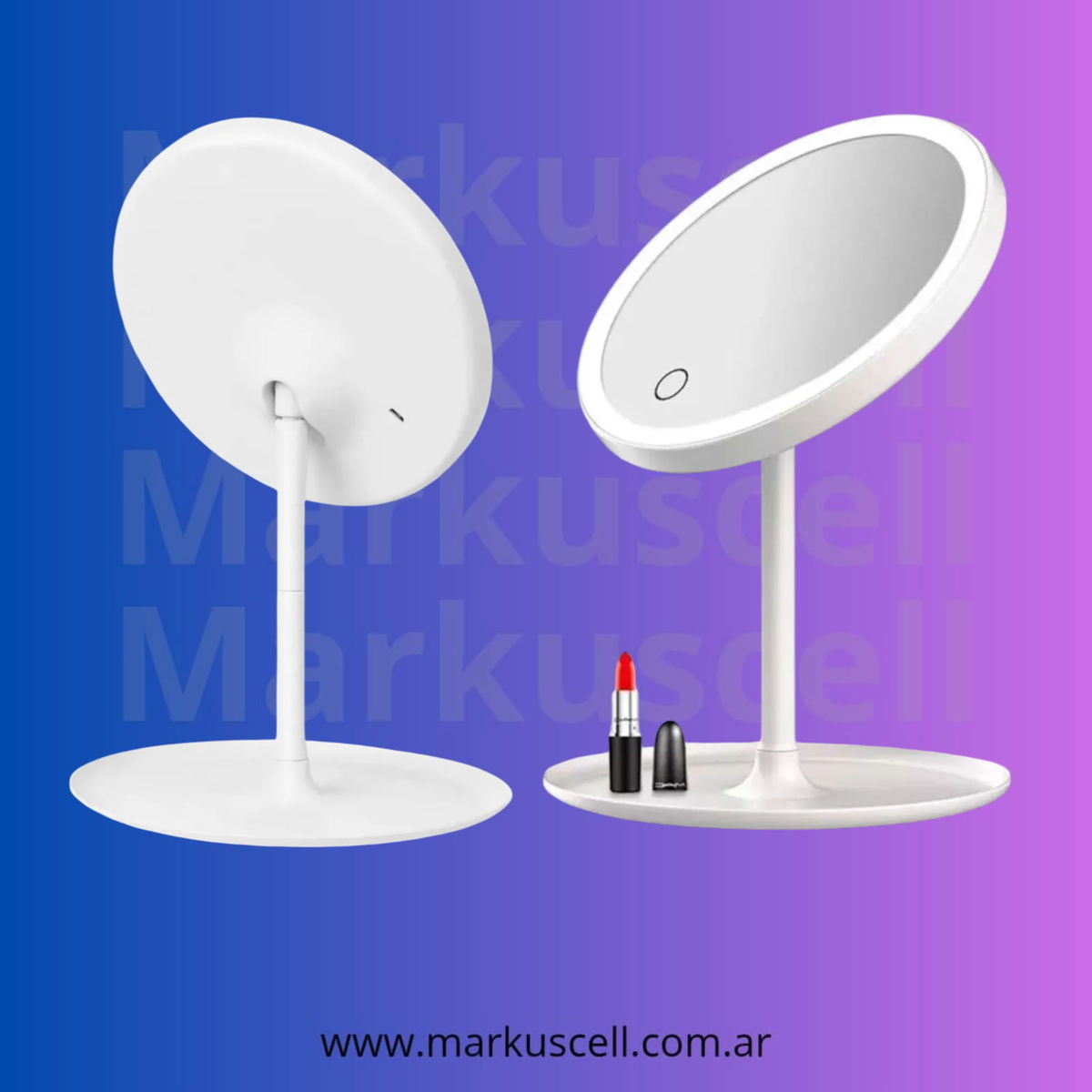 Este espejo de maquillaje es ideal para tu rutina diaria de cuidado personal. Cuenta con un diseño moderno y elegante, con rotación de 360° para ajustar fácilmente el ángulo según tus necesidades. La luz LED táctil integrada proporciona una iluminación clara y uniforme, perfecta para maquillaje, cuidado facial o afeitado.
