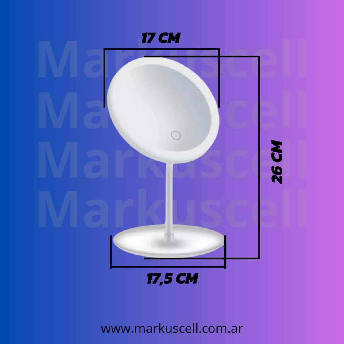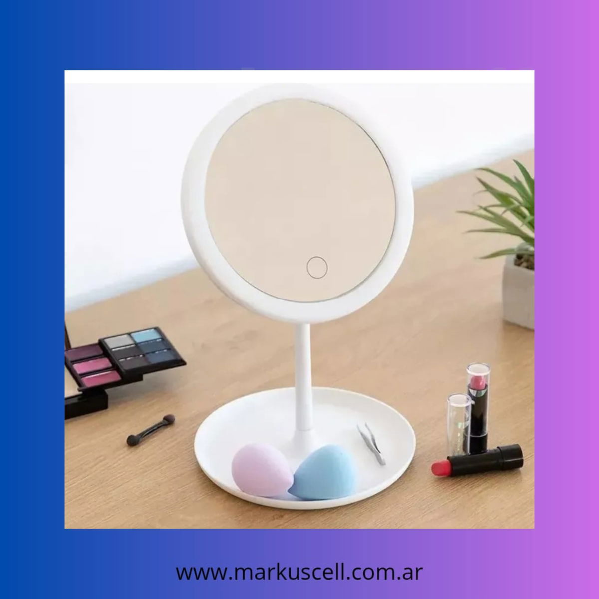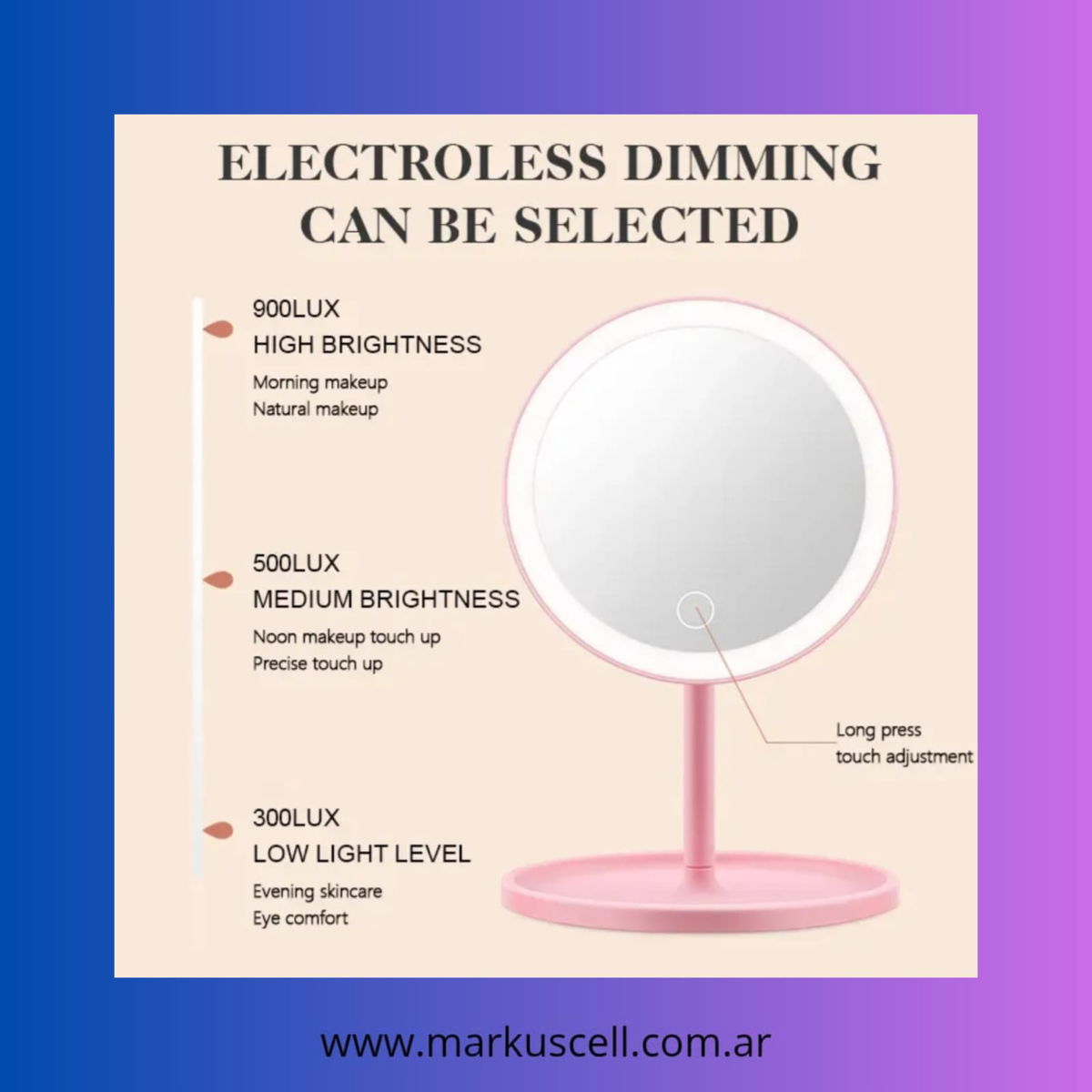 Este espejo de maquillaje es ideal para tu rutina diaria de cuidado personal. Cuenta con un diseño moderno y elegante, con rotación de 360° para ajustar fácilmente el ángulo según tus necesidades. La luz LED táctil integrada proporciona una iluminación clara y uniforme, perfecta para maquillaje, cuidado facial o afeitado.